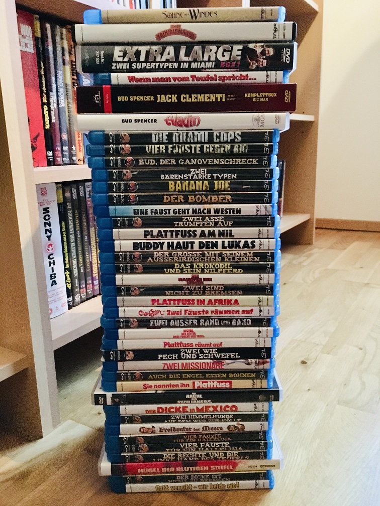 Nicht weniger als 40 Filme stehen mir bei diesem Marathon bevor. Das ist ein deutlicher Anstieg zu früheren Filmmarathons wie „James Bond“ mit 25 oder „Marvel Cinematic Universe“ mit 22. Wie ein Sportler muss ich mich scheinbar immer steigern. Abgesehen von Gastauftritten, Dokumentationen und diversen Fernsehproduktionen umfasst meine Liste fast alle Filme, in denen Mr. Spencer zu sehen ist. Nr. 36 und 38 sind übrigens auch Fernsehproduktionen und die ersten Folgen von zwei Serien, in denen Bud mitgewirkt hat, die aber dennoch ca. 90 Minuten laufen. Übrigens werde ich mir die meisten Filme auf Blu-ray ansehen, und ein paar DVDs sind auch dabei. Und ich bin mehr als froh, dass es die alten Streifen in schönen HD-Versionen gibt. Es ist nicht allzu lange her, da gab es sie nur mit einem auf 4:3 eingestampften und verwaschenen Bild zu sehen.