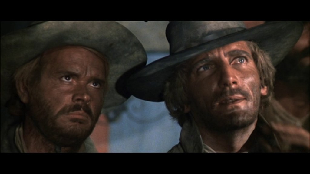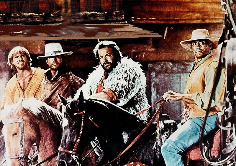 Indem er eine kleine Goldgräberstadt mit einer Bande von Ganoven terrorisiert, hat es der mächtige Honey Fisher geschafft, fast alle Schürfrechte von den Bewohnern an sich zu reißen. Auch vor Mord schreckt er nicht zurück. Ein einziger irischer Dickkopf wehrt sich gegen die Schurken, aber zum Glück sind da noch Cat (Spencer) und Hutch (Hill). Ich finde es witzig, dass Terence Hill in diesen Filmen Cat Stevens heißt, wie der bekannte Singer-Songwriter. Dessen Debütalbum „Matthew and Son“ kam gute sieben Monate vor Dio Perdona… Io no! – dem ersten Teil der Trilogie – heraus. Irgendwer von den Verantwortlichen war wohl ein Fan des damals noch neuen Sängers.