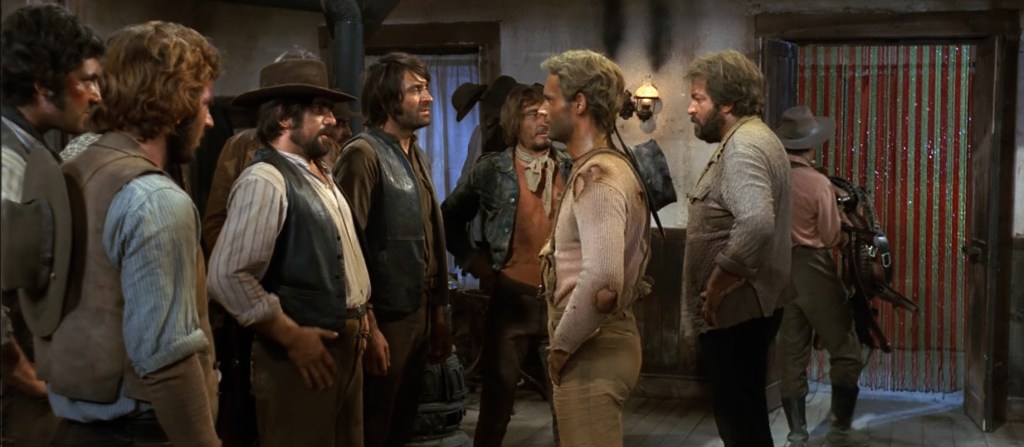 Auf Teil 6 des Marathons habe ich mich nicht nur gefreut, sonden mich regelrecht danach gesehnt. Die rechte und die linke Hand des Teufels, der zu Recht als Klassiker gehandelt wird, ist der inoffizielle Startschuss des Spencer/Hill-Phänomens. Bei dieser Westernkomödie wurde ihre Erfolgsformel gekocht, die von nun an galt: Sympathische Figuren + flotte Sprüche + Slapstick-Prügeleinlagen. Dazu eventuell noch eine Fress-Szene oben drauf. Nicht ganz unpassend wurden Spencer und Hill ab diesem Film von manchen als moderne Version von Laurel und Hardy gesehen.