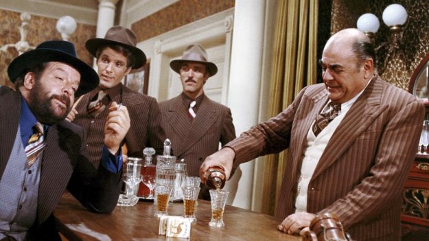Auch die Engel essen Bohnen fand ich als Kind schon langweilig und heute ebenso. Auf dem Papier klingt es nach einer netten Idee, aber das Ding will einfach nicht zünden. Terence Hill wollte zu der Zeit laut Spencer sein Glück in Hollywood probieren, oder er war mit Mein Name ist Nobody beschäftigt, also engagierte man statt ihm Giuliano Gemma, der für mich nur in ernsthaften Rollen funktioniert. Der Film war in Italien allerdings ein Erfolg und die Fortsetzung Auch die Engel mögen’s heiß folgte, in der man neben Gemma den schwedischen Athleten Ricky Bruch als Bud Spencer-Ersatz einsetzte. Auch die Engel essen Bohnen ist nicht wirklich mies, aber auch nicht clever genug, um lustig zu sein. Wenn man sich an einem ruhigen Sonntagnachmittag berieseln lassen möchte, gibt es Schlimmeres. Immerhin bekommt man im Finale eine Massenprügelei, die sich sehen lassen kann und Spaß macht.