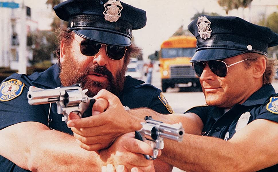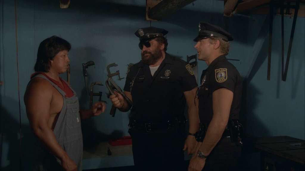 Bud Spencer spielte, wie gesagt, Steve und Terence Hills Figur heißt Doug. Nicht dass Charakternamen in diesen Filmen jemals wichtig gewesen wären, aber wenn schon bei der Namensgebung der Figuren geschludert wird, dann ist das wohl bereits ein erstes Indiz für eine schwache Produktion. „Doug“ klingt weich und runder und würde somit zu Spencer passen (der zuvor bei Zwei bärenstarke Typen den Namen Doug bekam), während „Steve“ zu einem aufgeweckten, schlanken Terence Hill passen würde. Am Ende des einfallslosen Films kommt es zu einer Schießerei in einer Lagerhalle, bei der niemand ernsthaft verletzt wird. Das Ergebnis einer Schießerei ist nicht, dass Leute in Öl ausrutschen und ihnen leere Holzkisten auf den Kopf fallen, sondern aufgeplatzte Körper und verlorene Leben. In einer Komödie ginge das durch, aber hier ist es unpassend. Also entweder eine Prügelei oder eine richtige Schießerei – So ein Mittelding braucht keiner.