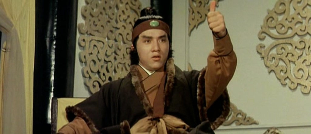 Jackie mimt hier ausnahmsweise einen intriganten Gegenspieler. In meinem Marathon finden sich ein paar wenige Filme, in denen er eine Nebenrolle spielt, das ist einer davon. Dem Mann gebühren schließlich nichts weniger als Hauptrollen. Würde der Film nicht als Jackie-Chan-Film vermarktet werden, hätte ich ihn gar nicht in die Marathon-Liste aufgenommen. In John Woos Hand of Death hatte Jackie eine größere Nebenrolle, hier waren ihm weit weniger Leinwandminuten vergönnt. Aber immerhin kämpft er zweimal gegen Hauptdarsteller Jimmy Wang Yu, der damals ein ungleich größerer Star als Jackie war. Jimmy Wang Yus Figuren funktionieren am besten, wenn sie – wie hier – großspurig und arrogant sind. Jackie wollte nie Bösewichte spielen und schlug deshalb später in seiner Karriere viele Rollenangebote aus Hollywood aus, darunter auch eine Einladung seines Freundes Sylvester Stallone, den Antagonisten in Demolition Man zu spielen.