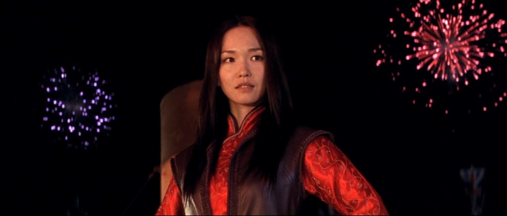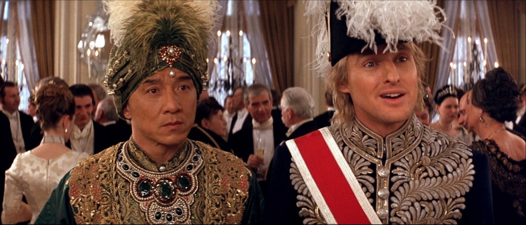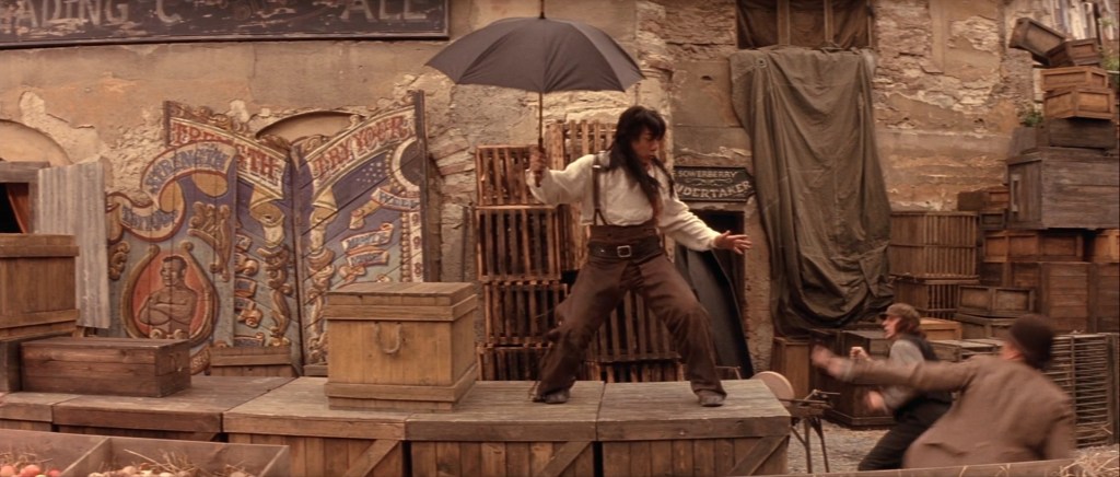 Überhaupt ist der gesamte Film ein Upgrade gegenüber dem Vorgänger. Die Kampfszenen sind deutlich besser, elaborierter und einfallsreicher. So blitzt sogar immer wieder mal etwas von der Jackie-Chan-Magie älterer Filme auf. An verschiedensten Locations werden Leitern, Kisten, Degen, Seile, Krüge, eine Drehtür, Regenschirme und andere Gegenstände in die Kämpfe eingebaut. Als ich im Abspann „Action Choreography by Jackie Chan“ las, machte das dann natürlich sehr viel Sinn. In Shanghai Noon hat er diesen credit nicht.