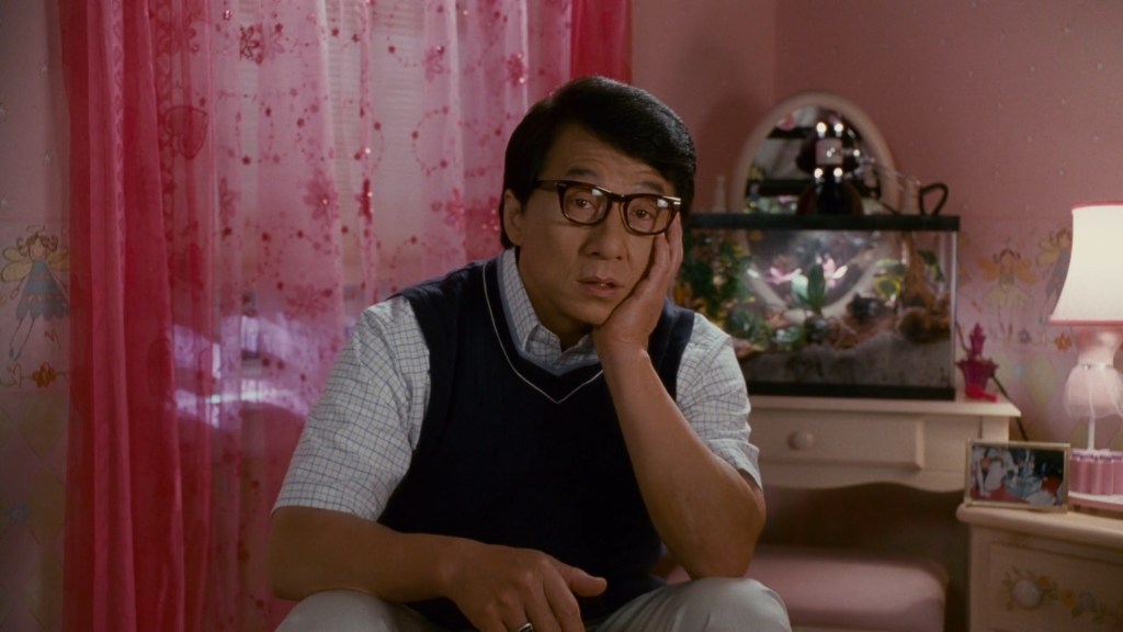 „Taffer Actionheld hat Stress mit Kindern“ hat mit Arnie in Kindergarten Cop noch halbwegs gut funktioniert. 2016 gab es davon eine Direct-to-DVD-Fortsetzung mit Dolph Lundgren. Die Disney-Produktion The Pacifier (Der Babynator) mit Vin Diesel von 2005 habe ich mir nicht angesehen und habe auch keine Absicht, das zu tun. 2010 kam The Spy Next Door nur eine Woche vor dem sehr ähnlich angelegten und minimal sympathischeren Tooth Fairy (Zahnfee auf Bewährung, 2010, ebenso Disney) mit Dwayne Johnson in die amerikanischen Kinos. In der Filmindustrie ist es nicht unüblich, dass konkurrierende Studios versuchen, einander das Publikum mit sehr ähnlichen Stoffen zu klauen. (Andere Beispiele: Missing in Action kam 1984 ein halbes Jahr vor Rambo: First Blood Part II heraus, ebenso wie No Strings Attached [Freundschaft Plus, Jänner 2011] vor Friends with Benefits [Freunde mit gewissen Vorzügen, Juli 2011].) „Taffer Actionheld hat Stress mit Kindern“ funktioniert bei Jackie weniger gut, weil die chinesische Frohnatur ohnehin drollig daherkommt, nicht so eine grobe Kante hat wie Schwarzenegger oder Diesel und obendrein körperlich nicht viel größer ist als die Kinder.