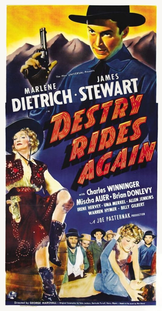 Destry Rides Again wird oft übersehen, da John Fords wegweisender, weitaus ernsterer Western Stagecoach mit John Wayne im selben Jahr erschien. Stewart wurde durch diesen Film und Mr. Smith Goes to Washington endgültig zum Star und machte erst ab den 1950ern wieder Western. In Destry Rides Again bekommt man einen wie immer formidablen Jimmy Stewart, sehr viel lebhaften Humor und einen wilden Catfight zwischen Marlene Dietrich und einer beleidigten Ehefrau. Dietrich erhielt durch diesen Film einen bitter nötigen Karriere-Boost und durch die zwei von ihr gesungenen Lieder wird das Ganze zwischenzeitlich zu einem Musical. 1962 spielte Stewart dann auch in einem Westernklassiker von John Ford mit: In The Man Who Shot Liberty Valance (wieder mit John Wayne) spielt er ebenso einen engagierten, intelligenten Charakter, der den Wilden Westen modernisieren und zivilisieren will. Mel Brooks‘ Comedy-Hit Blazing Saddles hat eine sehr ähnliche Handlung wie Destry Rides Again und Madeline Kahns Saloon-Sängerin Lili Von Shtüpp basiert auf Dietrichs Figur Frenchy.
